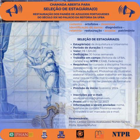 Está aberta a seleção de bolsistas de graduação em Arquitetura e Urbanismo para o projeto RESTAURAÇÃO DOS PAINÉIS DE AZULEJOS PORTUGUESES DO SÉCULO XIX NO PALÁCIO DA REITORIA DA UFBA, no que se refere ao levantamento cadastral e fotogranetrico, realização de diagnóstico de danos, relatórios, acompanhamento de ensaios e obra de restauração. Será uma grande oportunidade para trabalhar na área patrimonial!